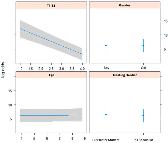 An ordinal logistic regression model was used to assess whether patient-related factors (age, sex), the type of treatment performed at T1 and T3, or the level of experience of the treating dentist (PD specialist or PD master student) were associated with the outcome. The analysis showed that definitely negative or negative behaviour at T1 (as rated on the FBRS) was the only statistically significant predictor of outcome (F3–F1; p < 0.0001). Other factors, including sex (p = 0.85), age (p = 0.95), and experience of the treating dentist (p = 0.67), did not show a significant association with the outcome. See Figure 2.