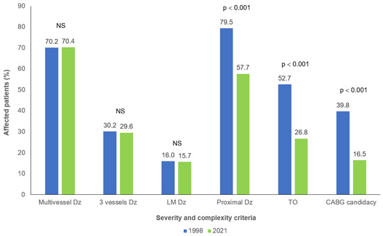 Coronary anatomy severity and complexity characteristics in patients with familial hypercholesterolemia and coronary artery disease between 1998 and 2021. NS: p > 0.1. CABG: Coronary artery bypass graft; Dz: Disease; LM: Left main; TO: Total occlusion.