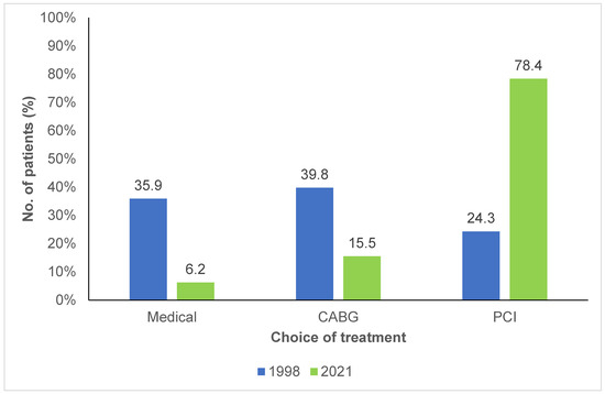 As shown in Figure 2, 39.8% of patients in the 1998 cohort were candidates for CABG, compared to 15.5% in the 2021 cohort (p < 0.001). In 1998, only a small number of patients underwent percutaneous coronary interventions (PCI), compared to the 2021 cohort, where the proportion had significantly increased, with 78.4% of the patients undergoing PCI.