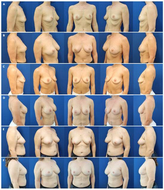 (A) A 37-year-old underweight patient with a BMI of 19 kg/m2 and invasive ductal carcinoma of the left breast and desire of mastectomy of the right breast before bilateral nipple-sparing mastectomy with inframammary approach (mastectomy weight ca. 150 g each) and pre-pectoral expander placement (Flora XMF-54; Establishment Labs). (B) One year following three sessions of autologous fat grafting (170 mL, 100 mL, and 160 mL each), and reverse expansion and exchange of the expanders for definitive, ergonomic implants (Motiva E2SM 250 mL, mini projection; Establishment Labs). BMI after finalization of reconstruction: 21 kg/m2. (C) A 44-year-old normal-weight patient with a BMI of 21 kg/m2 and BRCA-1 gene mutation before bilateral nipple-sparing mastectomy with inframammary approach (mastectomy weight ca. 220 g each) and pre-pectoral expander placement (Flora XMF-54; Establishment Labs). (D) Nine months following three sessions of autologous fat grafting (150 mL, 110 mL, and 120 mL each), and reverse expansion and exchange of the expanders for definitive, ergonomic implants (Motiva E2SM 330 mL, mini projection; Establishment Labs). BMI after finalization of reconstruction: 23 kg/m2. (E) A 46-year-old overweight patient with a BMI of 30 kg/m2, invasive ductal carcinoma T2N0, G3 right breast, and BRCA-1 gene mutation before bilateral skin-reducing mastectomy and pedicled nipple–areola complex (mastectomy weight ca. 470 g each), and pre-pectoral expander placement (Flora XMM-66; Establishment Labs). (F) Eighteen months following three sessions of autologous fat grafting (250 mL, 220 mL, and 190 mL each), and reverse expansion and exchange of the expanders for definitive, ergonomic implants (Motiva E2SD 360 mL; demi projection, Establishment Labs). BMI after finalization of reconstruction: 29 kg/m2.
