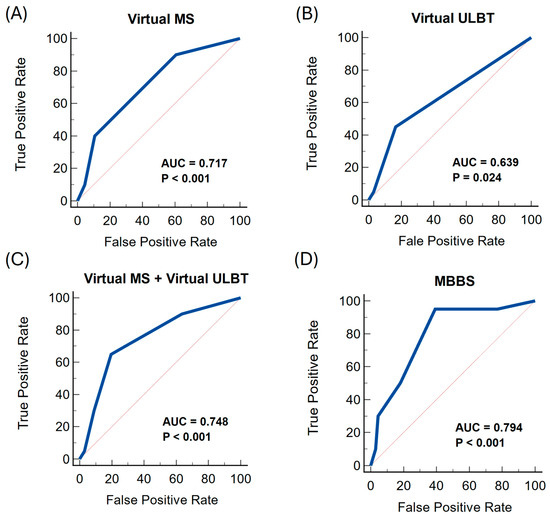 Notably, as individual tests to predict difficult airways, the vMS in Figure 1A and the vULBT in Figure 1B showed suboptimal performance only: AUC 0.72 and AUC 0.64, respectively. When used together, vMS and vULBT performed significantly better; AUC 0.75 (Figure 1C). A summation of the vMS (1/2/3/4), vULBT class (1/2/3), and patient BMI category (0/1/2) into a single Score, termed the “MBBS”, showed the best performance: AUC 0.79 (Figure 1D). Table 4 illustrates the other performance statistics of the various virtual airway assessment tests.