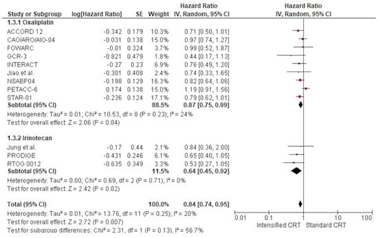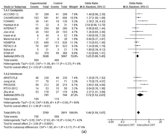 In the subgroup of RCTs adding oxaliplatin (6095 patients), there was a statistically significant increase in pCR (OR 1.25 (95% CI, 1.08–1.45) p = 0.002) with a very low heterogeneity I2 = 8%. With “robust analyses”, excluding one study at a time and evaluating 11 RCTs, no significant differences in treatment effect estimates were reported.