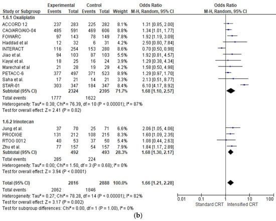 The effect of the different preoperative approaches on tumour regression (defined as the sum of patients with complete, near-complete, and moderate regression [35]) was reported in sixteen RCTs (5704 patients) and is shown in Figure 2b. Adding an intensified chemotherapy with standard radiochemotherapy enhanced tumour regression in all RCTs but three [15,16,21,34]. A statistically significant difference was found in six RCTs [14,19,20,23,24,25,27,33]. The pooled estimate of the treatment effect on tumour regression was significant (OR 1.66 (95% CI, 1.21–2.28) p < 0.00001). There was high heterogeneity between RCTs with an I2 = 82%. In the subgroup of RCTs adding oxaliplatin (4719 patients), there was a statistically significant increase in tumour regression (OR 1.68 (95% CI, 1.10–2.57) p < 0.00001) with a high heterogeneity I2 = 87%. With “robust analyses”, no significant differences in treatment effect estimates were reported. In the subgroup of RCTs adding irinotecan (982 patients), there was a statistically significant increase in tumour regression OR 1.68 (95% CI, 1.30–2.17) p = 0.0001).