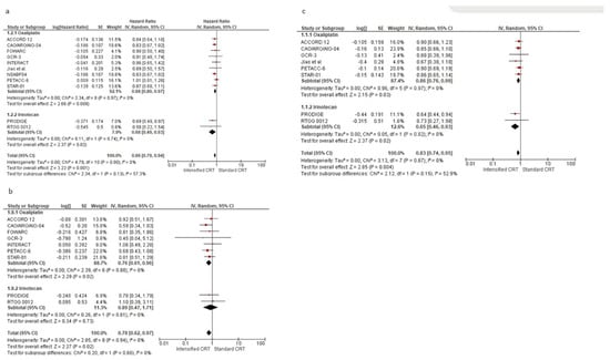 Seven RCTs (4406 patients) evaluated the control of distant metastases, as shown in Figure 3c. The pooled estimate of the treatment effect on DMFS was significant, HR 0.83 (95% CI, 0.73 to 0.95) p = 0.005, corresponding to a 17% reduction of the hazard of distant metastases for intensified CRT. No heterogeneity was demonstrated I2 = 0%. With “robust analyses”, excluding one study at a time, and therefore evaluating six RCTs, no significant differences in treatment effect estimates were reported.