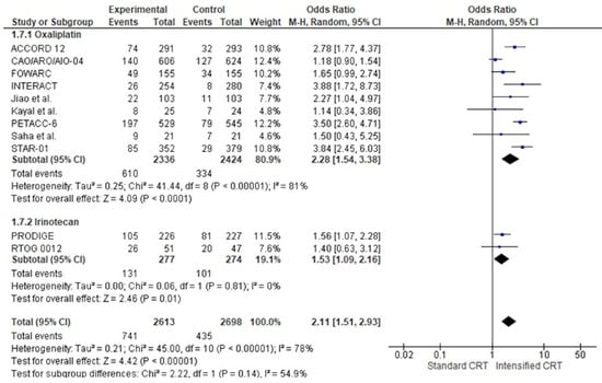 In the subgroup of RCTs adding oxaliplatin, the pooled estimate of adverse events was OR 2.4728 (95% CI 1.35–2.8554–3.38), p << 0.00001. In this group, patients treated with intensified chemotherapy with oxaliplatin were two times more likely to have an adverse event ≥ G3.