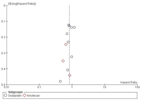 The funnel publication bias plot for the OS (Figure 6) and Egger’s test for publication bias showed that the risk of having missed or overlooked trials was not significant (p = 0.354).