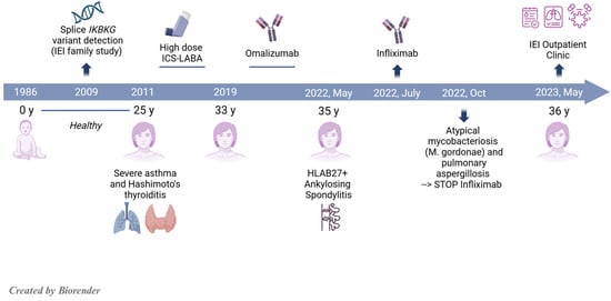 Our patient was healthy until the age of 25 when she suffered from severe asthma and Hashimoto thyroiditis; then, she developed HLAB27-positive ankylosing spondylitis, atypical mycobacteriosis, and pulmonary aspergillosis over time.