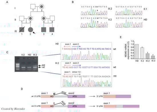 Characterization of NEMO-III.2. (A) Family pedigree showing proband III.2 (black arrow), her carrier mother II.2, her brother III.1, and cousins III.3 and III.4 affected by NEMO deficiency. (B) Sanger sequencing performed on III.2, II.1, II.2, and HD genomic DNA showing the NG_009896:g.10503G>T variant indicated by “*”. (C) cDNA analysis of IKBKG fragments obtained from III.2 and II.2. Black arrows indicate the wt and wt + mt sequences of II.2 and III.2, respectively, on the agarose gel. Chromatograms showing the NG_009896:g.10503G>T variant causing the retention of the intron between exon 1 and 2 in III.2 compared to HD. (D) Schematic of the normal (upper panel) and alternative splicing of IKBKG exon 1 and 2 detected in III.2. (E) Real-time PCR analysis showing reduced NEMO mRNA levels, normalized to β-Actin, in LCLs from II.2, III.2, III.3, and HD. The graph represents the mean of two experiments.