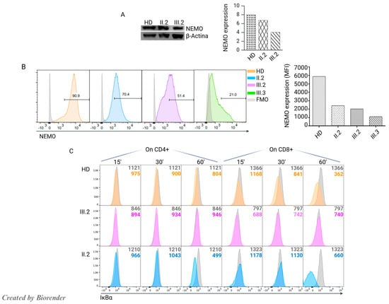 Functional analysis of NEMO. (A) NEMO protein expression by WB performed on PBMCs derived from III.2, II.2, and one HD showing reduced protein expression in III.2 and a slight reduction in II.2. (B) NEMO protein expression by FACS on LCLs from one HD, II.2, III.2, and the NEMO-pt III.3. The gray histograms represent FMO, the orange histograms represent HD, the blue histogram represents the mother’s cells, the pink histogram shows reduced expression in III.2, and the green histogram represents nearly absent NEMO expression in III.3; the right graph shows the MFI. (C) Representative plots of IkBα degradation in CD4+ and CD8+ T cells from III.2, II.2, and HD. The numbers inside the plots represent the MFI. The gray histograms show IkBα expression at time 0 without stimulation. The colored histograms show IkBα degradation after stimulation with PMA/ionomycin.