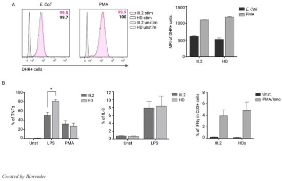 Functional characterization of III.2. (A) Evaluation of NADPH oxidase activity on neutrophils showing normal respiratory burst. Filled gray histograms represent unstimulated III:2 neutrophils, empty gray histograms represent unstimulated HD neutrophils, filled pink histograms represent stimulated III.2 neutrophils, and empty black histograms represent stimulated HD neutrophils. The right graph shows the MFI (mean ± SEM of n = 2 experiments). (B) Monocytes’ cytokines. The left panel shows decreased monocytes’ TNFα production p value (*) 0.0244 (mean ± SEM of n = 2 experiments), the middle panel shows normal monocytes’ IL-8 production (mean ± SEM of n = 2 experiments), and the right panel displays decreased IFNγ production from CD3+CD45RA− memory T cells (mean ± SEM of n = 2 experiments) after indicated stimulations.