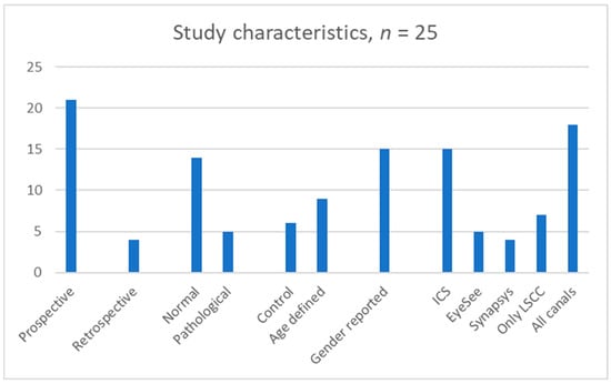 Study characteristics: ICS—ICS Impulse; EyeSee—EyeSeeCam; LSCC—Lateral semicircular canal; number of studies is represented on y axis.