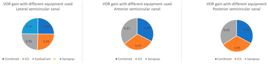 Figure 4 presents a box and whisker plot of the average VOR gain in the normal population in different canals. Figure 5 shows the VOR gain with different equipment used for lateral, anterior, and posterior semicircular canals.