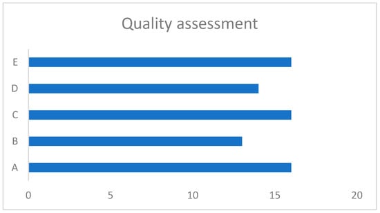 Quality analysis (n = 19). Legend: A: Addressal of research question; B: representativeness of target population; C: appropriate measurements and statistical methods; D: low nonresponsive bias; E: good/reasonable quality.