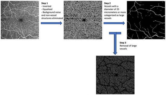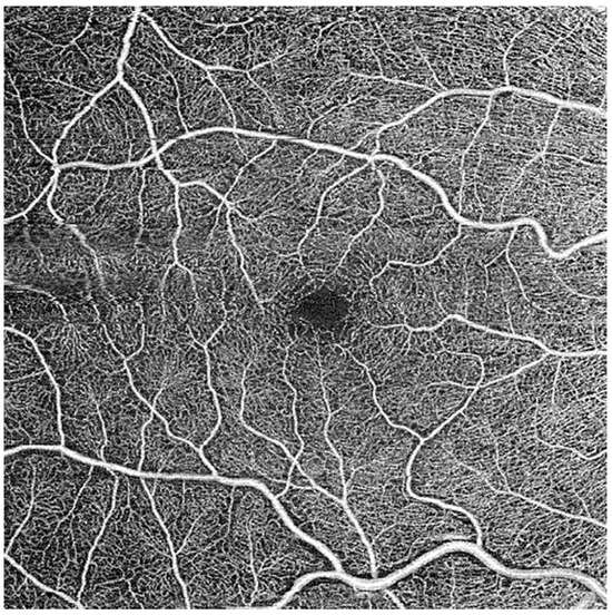 Images were obtained using a Zeiss PLEX Elite 9000 OCTA device (Carl Zeiss Meditec Inc., Dublin, CA, USA). Images of the retinal vasculature are obtained via B scans and analyzed from both intensity and phase information. Each image consisted of a 6 × 6 mm2 angiogram, generated in <3 s by taking 4 sequential B scans at a specific y-axis location (Figure S1). The y-axis locations were each scanned during this process. The incorporation of FastTrac technology helped eliminate movement artifacts to generate clear real time retinal imaging. Vasculature from the internal limiting membrane to the inner plexiform layer is termed the superficial vascular plexus (SVP), while vasculature from the inner nuclear layer to the outer plexiform layer is termed the deep vascular plexus (DVP). Angiograms of the SVP and DVP were exported and processed for analysis (Figure 1). Processing of images included separation of large and small vessels and fractal analysis.