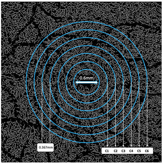 Vessels with a diameter of 25 μm or more were categorized as large vessels and subsequently removed, leaving behind only microvasculature (Figure 2). The microvessels were then skeletonized and partitioned. The software calculated the center of the foveal avascular zone (FAZ), which was used to define an annular zone in the images. An area with a 0.6 mm diameter, centered on the FAZ, was excised from the image. The remaining area, spanning from 0.6 mm to 5.0 mm in diameter, was defined as the annular zone (entire annulus) with a bandwidth of 2.2 mm. This annular zone was further divided into six annuli, each with a bandwidth of 0.37 mm (Figure 3).