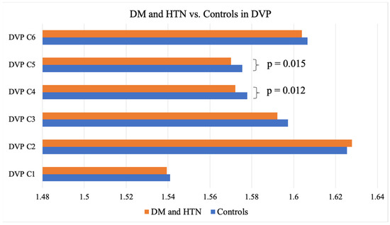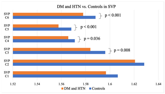 As evidenced by the FD means, individuals with DM showed significantly lower FDs in the C5 partition of the DVP, representing an area between 1.77 mm and 2.14 mm away from the center of the fovea when compared to the controls without DM (1.57 ± 0.003 vs. 1.58 ± 0.006; p = 0.014) (Table 2). Those presenting with both DM and HTN exhibited significantly lower FDs in the entire SVP anulus (1.84 + 0.01 vs. 1.85 + 0.007; p = 0.006), as well as the C3 (1.58 ± 0.02 vs. 1.60 ± 0.02; p = 0.008), C4 (1.57 ± 0.002 vs. 1.57 ± 0.01; p = 0.036), C5 (1.56 ± 0.01 vs. 1.57 ± 0.008; p < 0.001), and C6 (1.58 ± 0.01 vs. 1.59 ± 0.008; p < 0.001) partitions of the SVP (1.03 mm to 2.50 mm from the center of the fovea) and the C4 (1.57 ± 0.008 vs. 1.58 ± 0.008; p = 0.015) and C5 (1.57 ± 0.01 vs. 1.58 ± 0.006; p = 0.012) partitions of the DVP (1.40 mm to 1.77 mm from the center of the fovea) when compared to the controls (Table 2, Figure 4 and Figure 5). Neither the DM, HTN, nor DM and HTN groups showed significant changes in FDs in either the C1 or C2 partitions, representing the areas closest to the foveal avascular zone (0.30 mm to 1.03 mm from the center of the fovea).