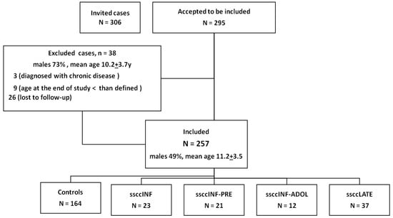 Flowchart of included and excluded cases. Overall, 257 subjects were included and divided into the following 5 groups based on the longest duration of systemic steroids use: control group (CG)—children who had never been prescribed systemic steroids; SSCC-INF group—children who used an SSCC during infancy (<2 years old) and did not require corticosteroid therapy afterward; SSCC-INF-PRE group—children who used an SSCC during infancy and preschool years; SSCC-INF-ADOL group—children who used an SSCC from infancy up to adolescence; SSCC-LATE group—children who used an SSCC after infancy.