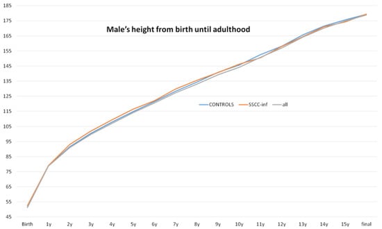 Males’ heights from birth to adulthood. No significant difference was found between the control (never used systemic steroids) and SSCC-INF (children who used an SSCC during infancy (<2 years old) and did not require corticosteroid therapy afterward) groups, p = 0.95.