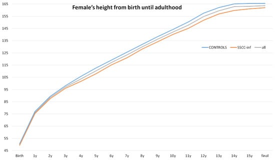 Females’ heights from birth until adulthood. No significant difference was found between the control (never used systemic steroids) and SSCC-INF (children who used an SSCC during infancy (<2 years old) and did not require corticosteroid therapy afterward) groups, p = 0.09.