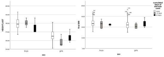 The influence of the cumulative days of steroids use during infancy on final height (p = 0.72) and BMI (p = 0.8), adjusted by sex.