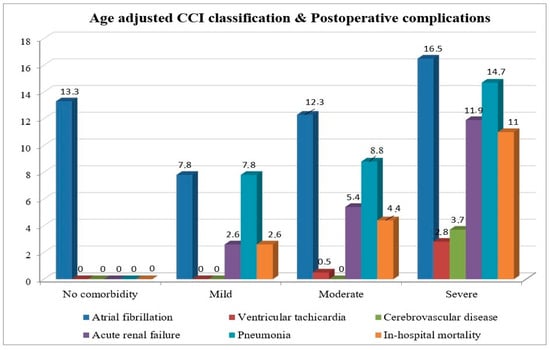 Figure 2. Postoperative complications and in-hospital mortality rates according to classification of age-adjusted CCI scores (p values are respectively: atrial fibrillation p = 0.23; ventricular tachycardia p = 0.2; cerebrovascular disease p = 0.015; acute renal failure p = 0.053; pneumonia p = 0.3; in-hospital mortality p = 0.053).