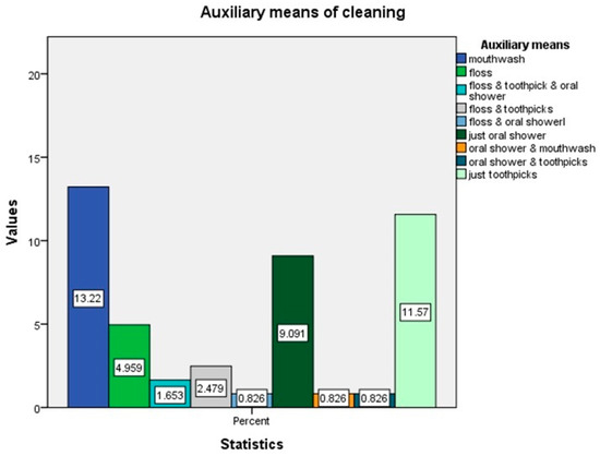 Additionally, 78.5% of respondents used fluoride toothpaste (M = 1.21, SD = 0.41). Mouthwash was the most commonly used auxiliary oral hygiene method, with 13.22% of respondents indicating their use; toothpicks were used by 11.57% of individuals, making it the second most popular auxiliary tool, while 54.55% did not employ any auxiliary dental care methods beyond tooth brushing (Figure 2).