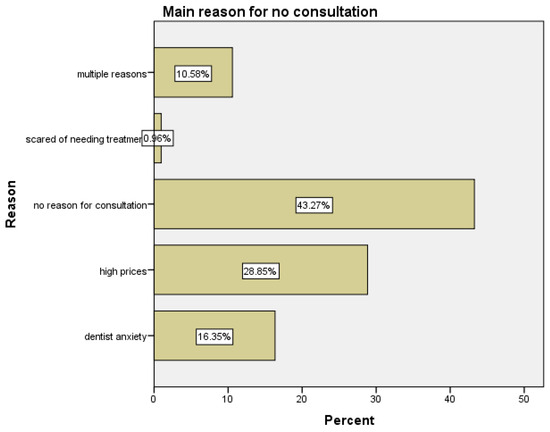 The most common reason, cited by 43.27% of respondents, was having no reason to consult, followed by high costs, which affected 28.85% of individuals. A significant portion (10.58%) provided other reasons for avoiding dental consultations, while dentist anxiety impacted 16.35%. Only a minimal number of participants indicated a fear of treatment as a main and singular reason for not consulting a dentist (0.96%). Some respondents also pointed to an unpleasant experience (2.47%) or a combination of high costs and fear/anxiety (1.63%) as deterrents. Smaller percentages indicated reasons like the high costs with no reason to consult (1.65%) or a mix of dentist anxiety and fear of treatment (0.82%). Additionally, concerns such as difficulty finding a dentist or fear of needing treatment were less frequently mentioned, each with percentages below 1%. All of the multiple reasons stated by the participants were taken into consideration as a global response under multiple reasons with a percent of 10.58% (Figure 3). These results emphasize that cost-related issues and a lack of perceived necessity are the predominant barriers to seeking dental care. These results highlight that a variety of personal, emotional, and financial factors influence individuals’ decisions to avoid dental consultations, with a notable proportion attributing their avoidance to reasons other than those typically explored in healthcare studies.