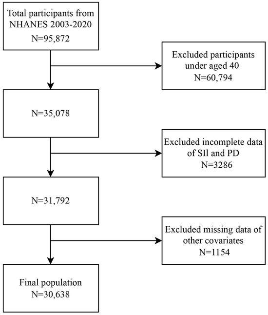 The NHANES is a cross-sectional U.S. survey employing a stratified multistage probability sampling method to monitor the nation’s health and nutritional status, providing critical data to policymakers, researchers, and the public. The survey data were gathered through home visits, screenings, and laboratory tests conducted at a mobile examination center (MEC). Survey data are released biennially. The NHANES data are publicly accessible at https://www.cdc.gov/nchs/nhanes/ (accessed on 1 December 2024). All participants provided written informed consent as approved by the NCHS Ethics Review Committee. The secondary analysis was exempt from additional Institutional Review Board approval. We analyzed data from nine to two years of NHANES cycles spanning from 2003 to 2020. Study participants, over 40 years old underwent interviews and assessments at the MEC. In addition, participants with missing data on PD, SII values, or covariates were excluded from this study. The final sample size used in our analysis was 30,638.