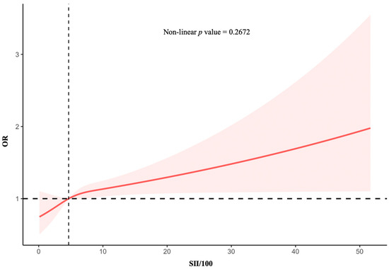 The restricted cubic spline plot describes the association between the SII/100 and the incidence of PD. The solid red line represents the smooth curve of fit between variables. The pink area represents the 95% confidence interval from the fit. This was adjusted for all covariates from Table 3. SII, systemic immune-inflammation index; OR odds ratio.