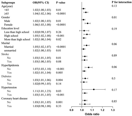 Subgroup analyses and interaction tests were performed to evaluate the associations between the SII and PD among different population subgroups stratified by age, sex, educational level, marital status, stroke, hyperlipidemia, diabetes, hypertension, and CHD (Figure 3). These subgroups subsequently underwent another round of analysis via a logistic regression model. In the subgroups categorized by age, sex, marital status, and hypertension status, the SII showed a significant association with PD across (all p < 0.05). For the subgroup stratified by stroke, diabetes, and CHD, significant correlations were observed only among the participants without these conditions. Moreover, a positive yet statistically insignificant correlation was identified between the SII and PD in participants with stroke, diabetes, and CHD, with OR values of 1.03, 1.02, and 1.03, respectively. The interaction test indicated no significant differences in the relationships between the SII and PD incidence across various factors, including age, educational level, marital status, stroke, hyperlipidemia, diabetes, and hypertension. These factors did not significantly influence the positive relationship, as all interaction p-values exceeded 0.05. However, there were notable interactions in the sex subgroups. Specifically, the correlation between the SII and PD was stronger in females (OR = 1.06) than in males (OR = 1.02).