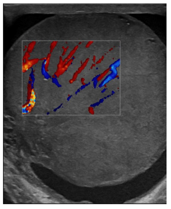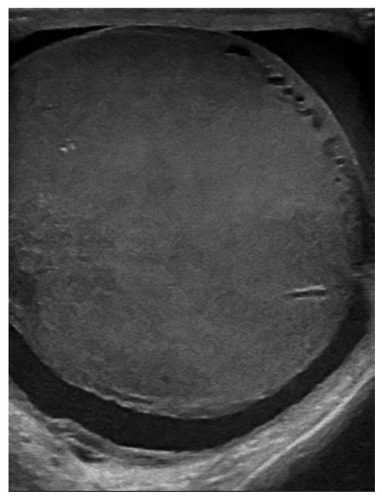 Testicular ultrasound revealed an enlargement of the left testicle approx. 63/55 mm, with diffuse heterogeneous infiltrated structure and vascular signal present on Doppler and B-Flow imaging, without specific intraparenchymal masses detectable ultrasonographically, with a transonic vaginal reaction with a diameter of approximately 7 mm (Figure 1, Figure 2 and Figure 3).