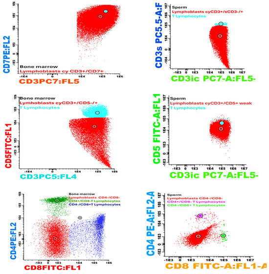 Immunophenotyping of the seminal fluid using a panel including CD45, CDCD3s, CD3ic, CD4, CD5, CD8, and CD99 identified 36% atypical cells with the following immunophenotype: CD3ic+, CD3s−/+, CD99+, CD4−, and CD8−. This result indicated that the pathological product is infiltrated with atypical cells with an immunophenotype consistent with the underlying disease (T-ALL). This analysis was performed using the Dx FLEX 3 laser and 13-color analyzer (utilizing five colors) (Figure 7).
