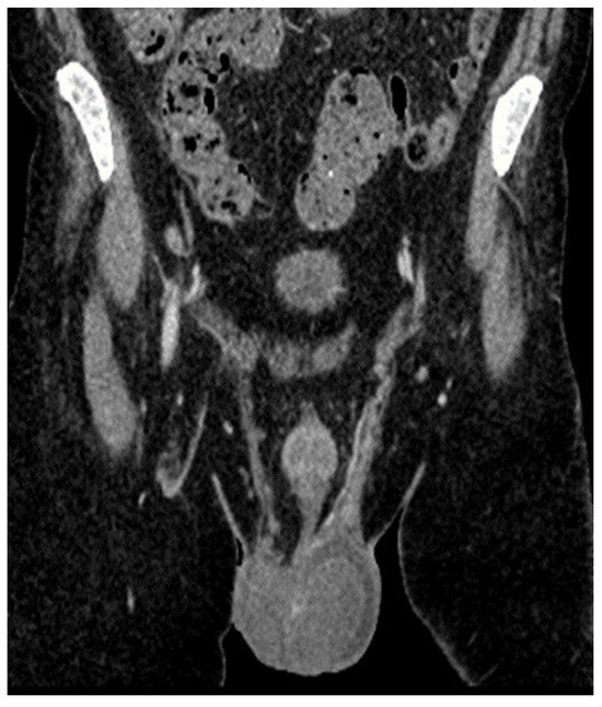 Abdomino-pelvic CT with contrast substance, coronal plane sections: Left testicle.
