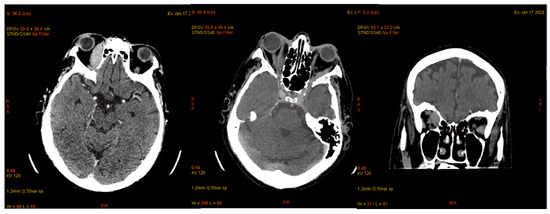 Cerebral CT, May 2023. The bilateral intraorbital tissue masses are no longer evident compared to previous examinations, and there are no areas of ischemia or meningoencephalic infiltration.
