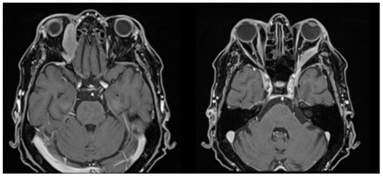Cranial MDCT examination on 7 January 2023, showed grade II/III right exophthalmos and pseudophakia in the right eye. An intraorbital, extraconal tissue mass was noted on the superointernal wall of the right orbit, measuring approximately 1.7 × 4.2 cm and displacing the medial portion of the right internal rectus muscle while contacting the middle portion of the right optic nerve. There was also a small area of discontinuity in the right lesser wing of the sphenoid bone, characterized as osteolytic, with an extraneural tissue component measuring approximately 0.7 × 1.2 cm located at the anterior floor of the middle cranial fossa. Grade II left exophthalmos was observed, with no changes in the left eye or retro-ocular fat. Minimal thickening of the left internal rectus muscle was noted in the anterior half, with a maximum diameter of approximately 5 mm, and the left lateral rectus muscle showed a posterior half-thickness of approximately 6 mm (Figure 9).