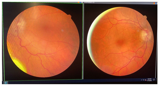 Fundoscopic examination showed an intact disc margin in the right eye, accompanied by slight fading and a non-absorbed hemorrhage at the 6 o’clock position. The left eye exhibited a faded disc margin with discoloration and a similar hemorrhage that had not absorbed. Visual field testing for the right eye indicated enlargement of the blind spot and decreased retinal sensitivity in the central area. Optical coherence tomography (OCT) revealed no significant changes in the right eye, while findings in the left eye indicated optic nerve atrophy consistent with non-arteritic ischemic optic neuropathy (NAION) and the presence of an orbital tumor (Figure 12).