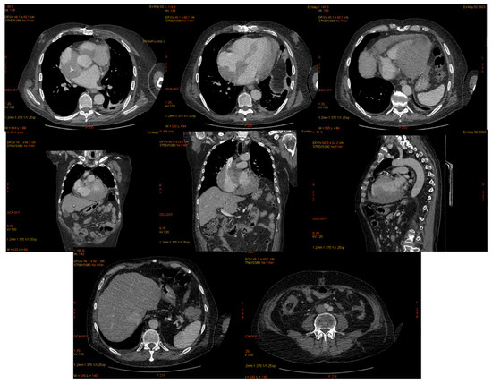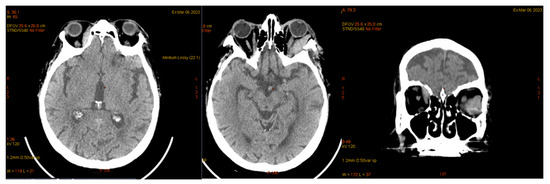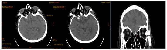 On 6 March 2023, the patient was diagnosed with influenza B, which resulted in a delay in the planned chemotherapy regimen. A subsequent CT scan of the brain and thoraco-abdominal region was performed to assess the patient’s condition (Figure 13).
