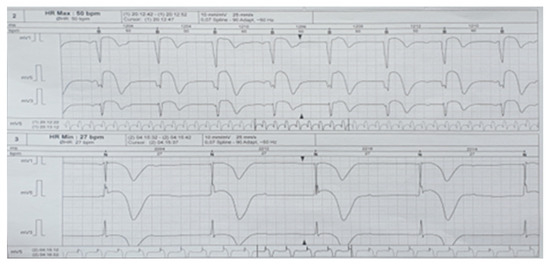 The 24 h Holter ECG examination recorded complete atrioventricular block (BAV) with junctional and ventricular escape rhythm with QRS complexes of two different morphologies, with a maximum heart rate (AV max) of 73 bpm, a minimum heart rate (AV min) of 27 bpm, and a mean heart rate (AV average) of 37 bpm (Figure 15).