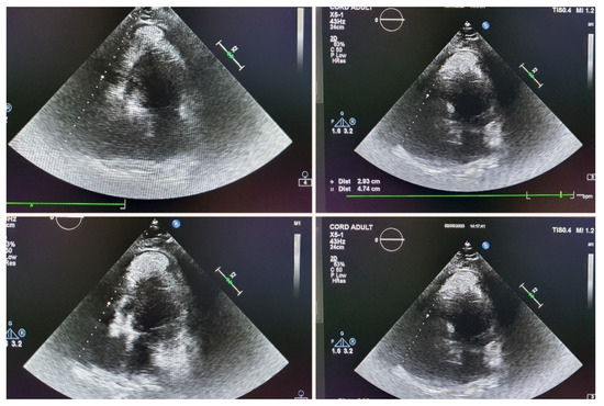 Echocardiographic evaluation revealed a dilated left atrium with a thickened lateral wall. The left ventricle was of normal size, but the interventricular septum was thickened and demonstrated global hypokinesis, resulting in slightly impaired systolic function, with an ejection fraction of 45%. Additionally, an oval-shaped pericardial formation was identified at the apex of the left ventricle, measuring 30 × 48 mm. This mass was in contact with the left ventricular wall and appeared to invade the myocardium. A fine pericardial layer was noted lateral to the left ventricular wall, with no significant valvular pathology observed (Figure 16).