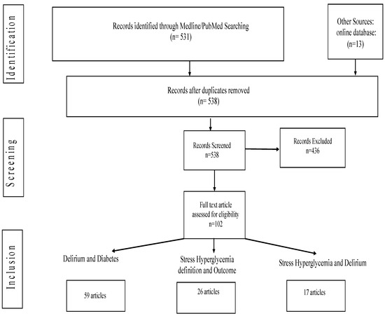 Overall, 544 articles were identified, and after removing duplicates, a total of 538 articles were considered for title and abstract screening. A review of titles, abstracts, and full-length articles resulted in a final selection of 59 articles for the association of diabetes with delirium, 26 articles for the definition of stress hyperglycemia and outcome, and 17 studies for the association of stress hyperglycemia and delirium (Figure 1).