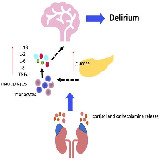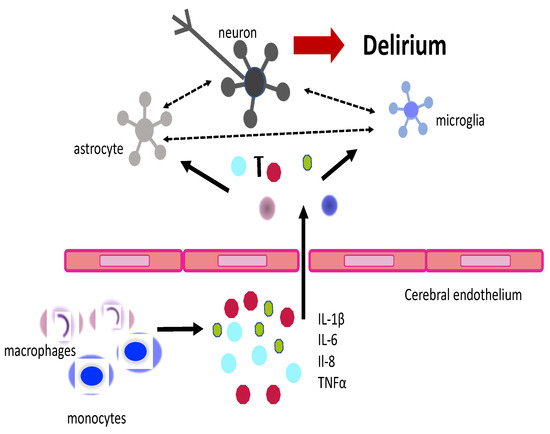 The pathogenesis of delirium remains unclarified; however, different pathways have been proposed, such as the reduction in cerebrovascular blood flow, the modification of cerebral metabolism, dopamine excess, and the acetylcholine deficiency alternation of the sleep–wake cycle and inflammation. The activation of systemic inflammatory cascade and the dysregulation of cytokines may be crucial for the onset of delirium [128]. Systemic inflammation triggers the release of tumor necrosis factors (TNFs) IL-1B and IL-6 by the activation of leucocytes, macrophages, and monocytes. In addition, the activation of Toll-like receptors on macrophage cells residing in the choroid plexus and circumventricular organs and the activation of IL-1 receptors of the endothelial cells of brain venules enhance the production of pro-inflammatory cytokines, which may compromise the blood–brain barrier [1,129]. IL-1 acts directly on multiple brain cells, such as astrocytes, and facilitates the homing and recruitment of leucocytes to the brain, which contributes to cognitive disfunction. Indeed, increased levels of cerebrospinal fluid and IL-1B and IL-8 were reported in patients with hip fracture and delirium compared to patients who did not have delirium [130,131]. Furthermore, in response to acute systemic inflammation, microglial cells enhance the synthesis of IL-1, and their activation has been associated with delirium and cognitive decline [132,133].