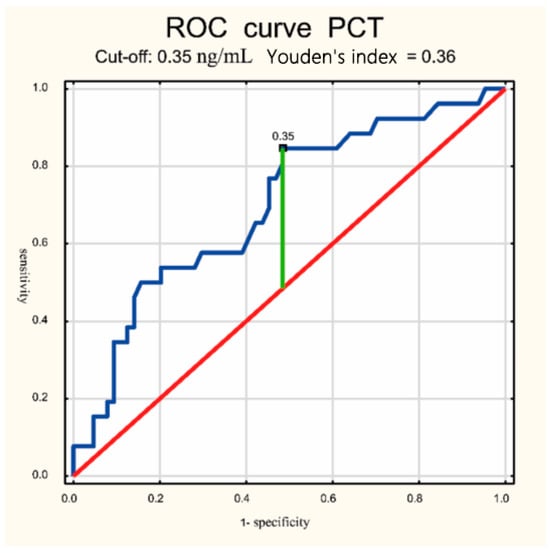 The significance of CSF PCT in neonatal meningitis has not been widely studied to date. The topic has been addressed in only a few publications involving a small number of cases. With the exception of the study performed by Reshi et al. [23] on 75 neonates with meningitis, they were conducted on a small group of neonates diagnosed with meningitis, as 18 in Dutta et al. [24], 29 in Nagaraj et al. [25], and 17 in Rajial et al. [26]. The present study analyzed a group of 33 neonates with and 77 without meningitis. In the course of this study, it was shown that CSF PCT (median, IQR) was significantly higher in the meningitis group compared to the non-meningitis group: 0.93 (0.39–1.59) vs. 0.34 (0.195–0.74) ng/mL (p < 0.003). These results are consistent with those of previous studies in neonates by Reshi et al. [23], Dutta et al. [24], Rajial et al. [26], and Nagaraj et al. [25]. In this study, the CSF PCT in both groups was higher than in previously published works, as Reshi et al. found a median (Q1, Q3) of 0.47 (0.38–0.88) vs. 0.26 (0.21–0.28) ng/mL (p< 0.001) [23]; in Nagaraj et al. 0.194 (0.034–0.534) vs. 0.012 (0.012–0.012) ng/mL (p < 0.001) [25]; and in Rajial et al. 0.31 vs. 0.11 ng/mL (p < 0.001) [26]. Only in the study of Dutta et al. were the mean values of CSF PCT in the meningitis group slightly higher (0.967 ng/mL) and slightly lower in the non-meningitis group (0.318 ng/mL (p < 0.028)) than those presented in this work [24]. The reasons for the higher PCT values found in the study may be due to differences in various kinds regarding the study group compared to groups evaluated by other researchers. Also, the timing of the test from the time of neonatal deterioration may have influenced the higher CSF PCT levels in this study. The median age at the time of lumbar puncture was 5 days, and previous antibiotic exposure was not an exclusion criterion for the study; 80% of the newborns included in this study were on antibiotic therapy. Rajial et al. used birth age as an inclusion criterion and included neonates born above 34 completed weeks of gestation, and excluded neonates who were on antibiotic therapy [26]. Reshi et al. recruited only neonates up to 28 days of age and with a higher weight (median 2800 g), excluded neonates who had received antibiotics before lumbar puncture, and made adjustments for traumatic pleocytosis [23]. Dutta et al. qualified neonates between 0 and 56 days of life, and excluded neonates who had received at least one dose of antibiotics before lumbar puncture and with a traumatized CSF sample [24]. Nagaraj et al., on the other hand, did not include neonates who had received antibiotics for more than 2 days before the lumbar puncture [25]. In this study, the cutoff point for CSF PCT as a marker of neonatal meningitis ≥ 0.35 ng/mL had a sensitivity of 82%, specificity of 52%, 95% confidence interval 0.58–0.82, and the positive and negative predictive value was 54% and 20%, respectively. The obtained sensitivity value for PCT CSF as a marker of meningitis is high and specificity is lower, which limits the usefulness of this indicator as a single marker of meningitis. Reshi et al. proposed a cutoff point for CSF PCT very similar, as it was ≥0.33 ng/mL (sensitivity 92%, specificity 87%, 95% confidence interval 0.887–0.964, positive and negative predictive value 85.2% and 93%) [23]. Other cutoff points for CSF PCT have been described by subsequent investigators. Rajian et al. showed that the cutoff point value ≥ 0.2 ng/mL had a sensitivity of 95.2% and specificity of 96%, a 95% confidence interval of 0.98–1.00, and a positive and negative predictive value of 95.45% and 100%, respectively [26]. Nagaraj et al. found that with a cutoff value of 0.120 ng/mL of CSF PCT sensitivity of 83%, a specificity of 84% was reported [25]. In another study, Dutta et al. found that the optimal cutoff for CSF PCT was 0.554 ng/mL; at this value of PCT concentration in CSF, the sensitivity was 92%, specificity 87%, with a 95% confidence interval 0.487–0.826 [24]. Based on the results, there was a significant association between meningitis and PCT concentration values in CSF. However, the diagnostic efficacy of CSF PCT is moderate and is not superior to the standard tests used to date, i.e., CSF pleocytosis and CSF protein concentration. This conclusion is consistent with the results of Dutta et al. [24]. On the other hand, Reshi et al. [23], Rajian et al. [26], and Nagraj et al. [25] found that procalcitonin in CSF has diagnostic efficacy similar to the standard parameters assessed in cerebrospinal fluid.