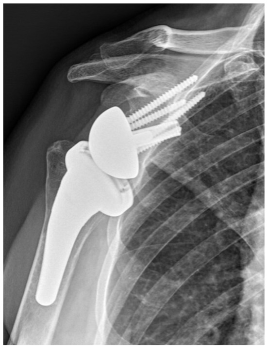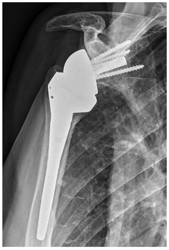 - Zmistowski, B.; Cahill, S.V.; Hill, J.R.; Gibian, J.T.; Sokrab, R.; Keener, J.D.; Aleem, A.W. The rate and predictors of healing of repaired lesser tuberosity osteotomy in reverse total shoulder arthroplasty. JSES Int. 2023, 7, 10–15. [Google Scholar] [CrossRef] [PubMed]