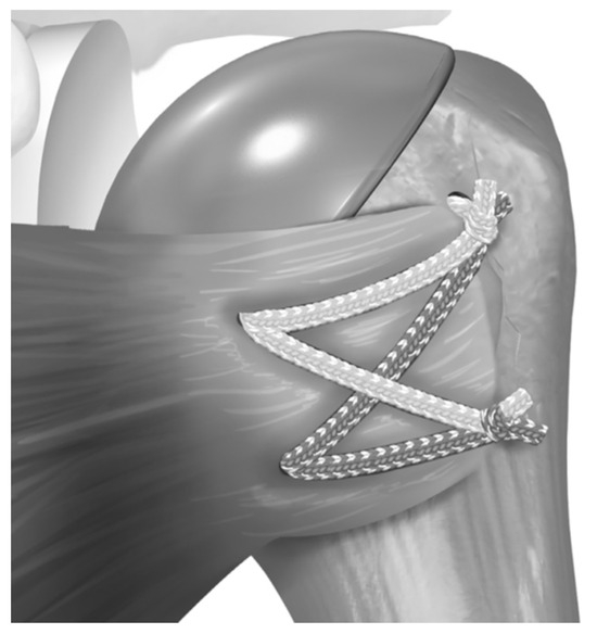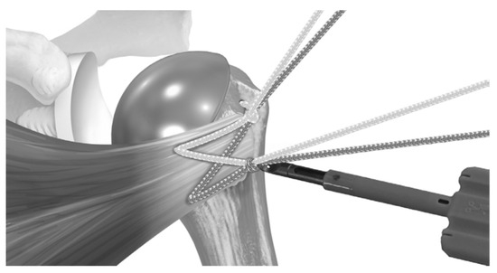 - Urita, A.; Funakoshi, T.; Horie, T.; Nishida, M.; Iwasaki, N. Difference in vascular patterns between transosseous-equivalent and transosseous rotator cuff repair. J. Shoulder Elbow Surg. 2017, 26, 149–156. [Google Scholar] [CrossRef] [PubMed]