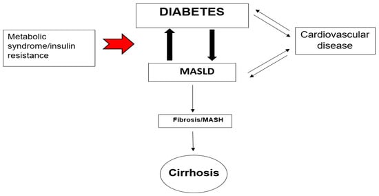The causal link between metabolic dysfunction-associated steatotic liver disease (ΜASLD) and cardiovascular disease (CVD) is well recognized, supported by various pathophysiological mechanisms that connect the two conditions. These mechanisms include endothelial dysfunction, altered lipid metabolism, systemic inflammation, plaque formation and instability, oxidative stress, and insulin resistance []. Ultimately, the disruption of the structure, function, and electrical activity of the cardiovascular system (CVS) increases the risk of developing CVD in patients with ΜASLD, leading to complications such as hypertension, atherosclerosis, arrhythmias, myocardial dysfunction, cardiac valve deformities, and venous thrombosis. ΜASLD is associated, due to insulin resistance, with dyslipidemia, characterized by increased levels of small dense LDL, elevated triglycerides, and reduced HDL cholesterol [,]. These lipid abnormalities, coupled with systemic inflammation, contribute to endothelial dysfunction and the accelerated development of atherosclerosis []. Atherosclerosis that occurs alongside metabolic dysfunction-associated fatty liver disease or metabolic dysfunction-associated steatohepatitis presents a greater metabolic burden than atherosclerosis on its own. In this regard, several studies have shown a significant link between ΜASH and: (1) carotid atherosclerosis and (2) subclinical signs of atherosclerosis in patients with or without type 2 diabetes (T2DM) []. These signs include increased intima-media thickness, endothelial dysfunction, arterial stiffness, impaired left ventricular function, reduced flow-mediated vasodilation, and coronary calcification []. In patients with both ΜASLD and T2D, the presence of insulin resistance amplifies these cardiovascular risk factors, leading to a higher incidence of cardiovascular events [] (Figure 2). Identifying individuals with ΜASLD could also help pinpoint a subgroup of diabetic patients who would benefit from more intensive treatment to reduce their risk of future cardiovascular events [].