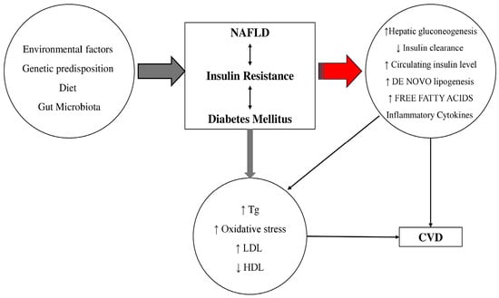 The pathophysiological link between metabolic dysfunction-associated steatotic liver disease (MASLD) (previously known as NAFLD: Nonalcoholic fatty liver disease), diabetes mellitus and cardiovascular disease (CVD). Tg: triglycerides; LDL: low-density lipoprotein; HDL: high-density lipoproteins. Insulin resistance is associated with an increase infree fatty acids that contributes to increased TG production that stimulates secretion of LDL in hepatocytes. Fat accumulation in the liver is associated with oxidative stress and lipid peroxidation. Additionally, an increased secretion of inflammatory markers and plasma glucose and a decrease in HDL concentration have been observed in MASLD patients. The result of this physiological dysfunction is increased risk for the development of diabetes and atherosclerosis and increased risk for coronary artery disease. The single arrows regardless of color and thickness mean “leads to”, the double thin black arrows indicate the interaction.
