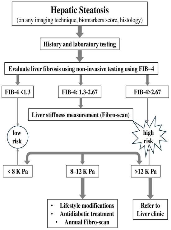 Diagnosing ΜASLD/ΜASH continues to be a challenge today. However, the future looks promising as screening that utilizes a combination of validated genetic, imaging, and plasma biomarkers will help improve management. It is an exciting era where increased awareness of the effects of MASH will lead to earlier diagnoses and treatments that could potentially change the disease’s progression and enhance the quality of life for millions of patients []. To diagnose MASLD, it is essential to rule out alcohol-related liver disease, which requires confirming an alcohol intake of less than 20–40 g per day []. Routine screening for MASLD in the general population is not advised but due to the well-established link between type 2 diabetes (T2DM) and metabolic dysfunction-associated steatotic liver disease (MASLD), the American Diabetes Association (ADA) and the American Association for the Study of Liver Diseases (AASLD) advise screening all T2DM patients for MASLD [] and its more advanced form, metabolic dysfunction-associated steatohepatitis (MASH) []. The Asian Pacific Association for the Study of the Liver (APASL) guidelines, also, for metabolic-associated steatotic liver disease (MASLD) advise that patients be monitored at regular intervals, with the frequency determined by the degree of hepatic fibrosis identified at baseline []. Among those diagnosed with MASLD, only patients at higher risk for developing complications require further evaluation and regular monitoring, as only a small percentage will face severe clinical events. The European Association for the Study of Liver Disease (EASL) recommends noninvasive initial assessments for individuals with metabolic syndrome, obesity, and type 2 diabetes mellitus (T2DM). Additionally, the American Diabetes Association (ADA) suggests annual liver transaminase assessments for those with T2DM. Liver biopsy is considered the gold standard for diagnosing MASH, but it has its drawbacks. As a result, there is an increasing use of noninvasive biomarkers []. However, relying solely on transaminases for screening is inadequate, as it may overlook a significant number of patients with advanced liver fibrosis (F2 or higher) having normal transaminase levels []. Patients at risk for advanced fibrosis include those with two or more metabolic risk factors as well as those with type 2 diabetes, identified hepatic steatosis, or elevated liver enzymes. For these individuals, a comprehensive history and laboratory tests should be conducted if they have not been already. These data can then be used to calculate the fibrosis-4 index (FIB-4), which estimates fibrosis risk based on age, AST, ALT, and platelet count. The development of less invasive and more consistent standards could speed up the approval of effective therapeutics []. The FIB-4 score helps classify patients into three risk categories: low risk (<1.3), indeterminate risk (1.3–2.67), and high risk (>2.67) for advanced fibrosis. For those at low risk, the American Gastroenterological Association (AGA) suggests retesting, including recalculating FIB-4, every 2–3 years, unless clinical changes occur. Patients at high risk should be referred directly to a liver expert. For those in the indeterminate category, further assessment with liver stiffness measurement (LSM) is recommended to refine risk classification. LSM results categorize patients into low (<8 kPa), indeterminate (8–12 kPa), and high (>12 kPa) risk groups (Figure 3).