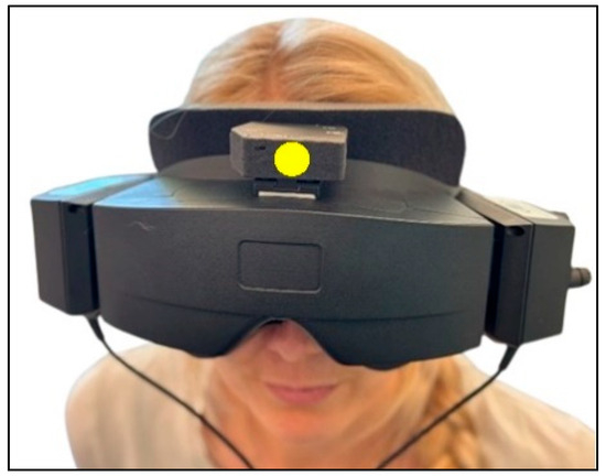 Videonystagmography goggles with inertial measurement unit sensor. All participants were fitted with the videonystagmography goggles with the 6 degrees of freedom inertial measurement unit attached on top of the goggles (marked with a yellow dot).