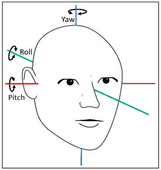 The three axes of rotation describing the orientation of the human head. Movements around the pitch, roll, and yaw axes describe the orientation of the human head.