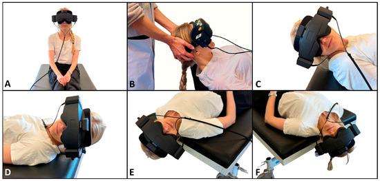 Traditional manual BPPV diagnostics. (A) Starting position. The participant sits upright with their head in a neutral position and is fitted with the videonystagmography goggles with an inertial measurement unit sensor attached on top. (B) Cranial position of the examiner with the participant in the supine position, with their neck flexed 30° (rotation around the pitch axis by −60° from the starting position). (C,D) Right and left sides in the Supine Roll Test, respectively. From the supine position, the head is rotated 90° to the right, followed by a 180° rotation to the left (rotation around the yaw axis by ±90°). (E,F) Right and left sides in the Dix–Hallpike test, respectively. Again, the participant initially sits upright (A). Their head is then rotated 45° to the side of the examined posterior canal (the contralateral side of the anterior canal) (rotation around the yaw axis by ±45°) and then moved backward to the supine position with the neck extended to 30° below the horizontal plane (total rotation of the body around the pitch axis by −120°).